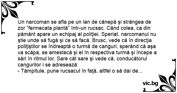 Un narcoman se afla pe un lan de cânepă şi strângea de zor ”fermecata plantă” într-un rucsac. Când colea, ca din pământ apare un echipaj al poliţiei. Speriat, narcomanul nu ştie unde să fugă şi ce să facă. Brusc, vede că în direcţia poliţiştilor se îndreaptă o turmă de canguri, sperând că aşa va scăpa, se amestecă şi el în respectiva turmă şi începe a sări în ritmul lor. Sare cât sare şi vede că, conducătorul cangurilor i se adresează: