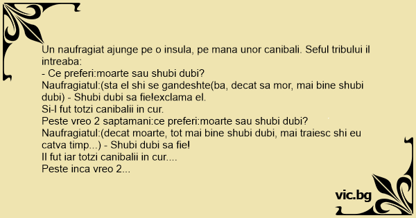 Naufragiatul:(sta el shi se gandeshte(ba, decat sa mor, mai bine shubi dubi) - Shubi dubi sa fie!exclama el.