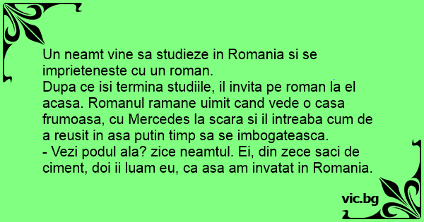 - Vezi podul ala? zice neamtul. Ei, din zece saci de ciment, doi ii luam eu, ca asa am invatat in Romania.