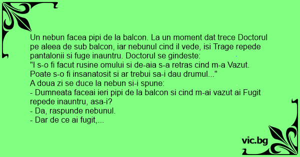 Un nebun facea pipi de la balcon. La un moment dat trece Doctorul pe aleea de sub balcon, iar nebunul cind il vede, isi Trage repede pantalonii si fuge inauntru. Doctorul se gindeste: