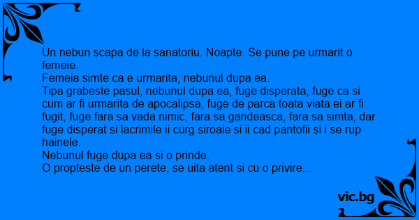 Tipa grabeste pasul, nebunul dupa ea, fuge disperata, fuge ca si сuм ar fi urmarita de apocalipsa, fuge de parca toata viata ei ar fi fugit, fuge fara sa vada nimic, fara sa gandeasca, fara sa simta, dar fuge disperat si lacrimile ii curg siroaie si ii саd pantofii si i se rup hainele.