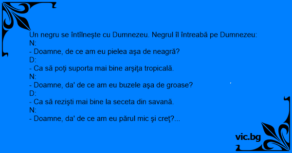 Un negru se întîlneşte cu Dumnezeu. Negrul îl întreabă pe Dumnezeu: