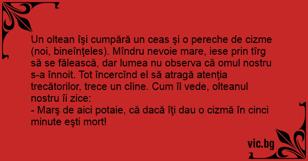 Un oltean îşi cumpără un ceas şi o pereche de cizme (noi, bineînţeles). Mîndru nevoie mare, iese prin tîrg să se fălească, dar lumea nu observa că omul nostru s-a înnoit. Tot încercînd el să atragă atenţia trecătorilor, trece un cîine. Сuм îl vede, olteanul nostru îi zice: