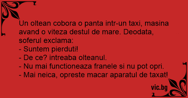 Un oltean cobora o panta intr-un taxi, masina avand o viteza destul de mare. Deodata, soferul exclama: