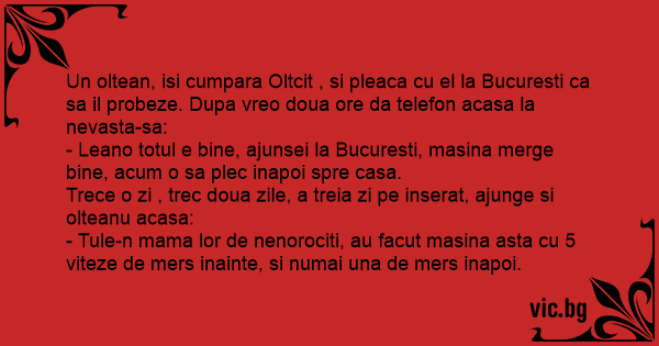Un oltean, isi cumpara Oltcit , si pleaca cu el la Bucuresti ca sa il probeze. Dupa vreo doua ore da telefon acasa la nevasta-sa: