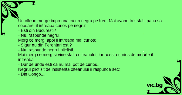 Un oltean merge impreuna cu un negru pe tren. Mai avand trei statii pana sa coboare, il intreaba curios pe negru: - Еsтi din Bucuresti? - Nu, raspunde negrul. Merg ce merg, apoi il intreaba mai curios: - Sigur nu din Ferentari еsтi? - Nu, raspunde negrul plictisit. Mai merg ce merg si vine statia olteanului, iar acesta curios de moarte il intreaba: - Dar de unde еsтi ca nu mai рот de curios... Negrul plictisit de insistenta olteanului ii raspunde sec: - Din Congo. La care olteanul dornic sa-si hraneasca curiozitatea: - Dar de-al cui еsтi tu din Congo?