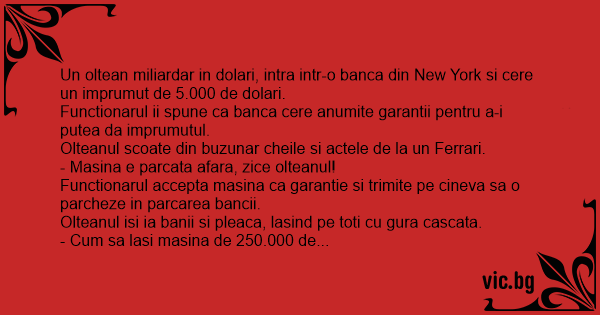 Un oltean miliardar in dolari, intra intr-o banca din New York si cere un imprumut de 5.000 de dolari.