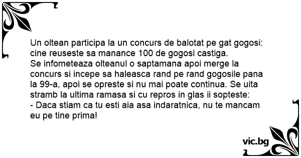 Se infometeaza olteanul o saptamana apoi merge la concurs si incepe sa haleasca rand pe rand gogosile pana la 99-a, apoi se opreste si nu mai poate continua. Se uita stramb la ultima ramasa si cu repros in glas ii sopteste: