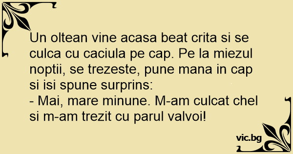 Un oltean vine acasa beat crita si se culca cu caciula pe cap. Pe la miezul noptii, se trezeste, pune mana in cap si isi spune surprins: