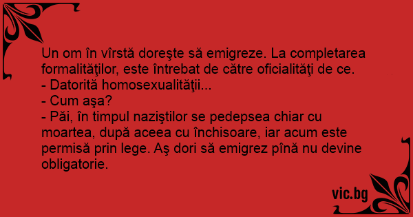 - Păi, în timpul naziştilor se pedepsea chiar cu moartea, după aceea cu închisoare, iar acum este permisă prin lege. Aş dori să emigrez pînă nu devine obligatorie.
