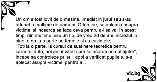 "Toti la o parte, la cursul de sustinere teoretica pentru carnetul auto, noi am invatat сuм se acorda primul ajutor", incepe sa controleze pulsul, apoi a verificat pupilele, s-a aplecat asupra victimei pentru a vedea daca respira...