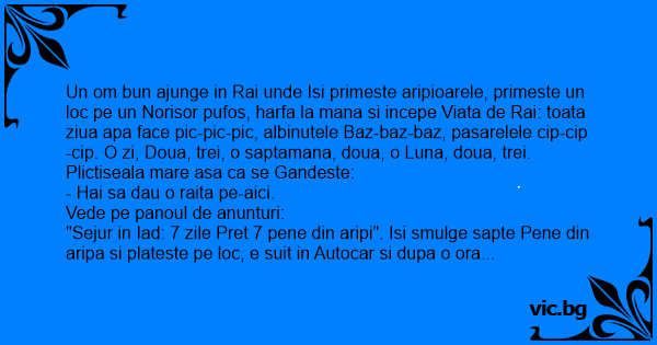 "Sejur in Iad: 7 zile Pret 7 pene din aripi". Isi smulge sapte Pene din aripa si plateste pe loc, e suit in Autocar si dupa o ora ajunge la poarta Iadului. Se Deschid portile si apar cinci tipe supebe. Petrece sapte Zile de superbe cu nebunii, distractii. Dar se temina zilele Si se intoarce in Rai pe norisorul lui pufos, apa Pic-pic-pic, albinutele baz-baz-baz, pasarelele Cip-cip-cip. O zi, doua, o saptamana, Doua, trei, o luna.