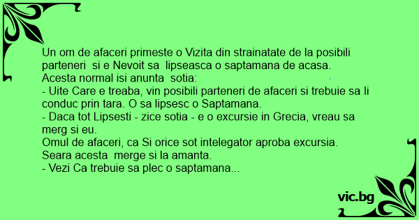 - Daca tot Lipsesti - zice sotia - e o excursie in Grecia, vreau sa merg si eu.