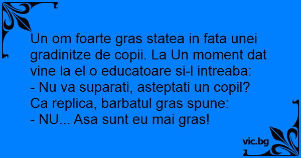 Un om foarte gras statea in fata unei gradinitze de copii. La Un moment dat vine la el o educatoare si-l intreaba: