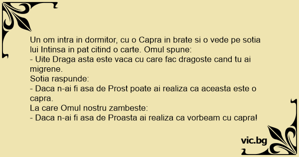 Мъжът влиза в спалнята с коза на ръце и казва: - Виж, това е овцата, която чукам, когато ти нямаш време! - Това е коза, тъпако, а не овца!" - Кой говори с теб!?