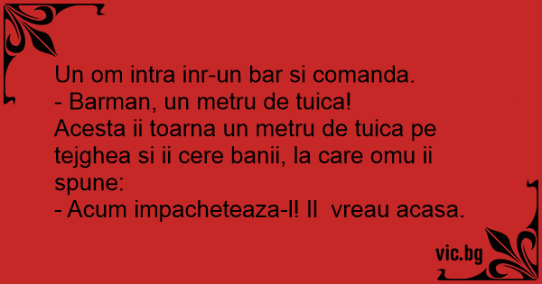 Acesta ii toarna un metru de tuica pe tejghea si ii cere banii, la care omu ii spune:
