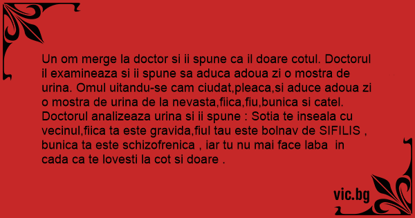 Un om merge la doctor si ii spune ca il doare cotul. Doctorul il examineaza si ii spune sa aduca adoua zi o mostra de urina. Omul uitandu-se cam ciudat,pleaca,si aduce adoua zi o mostra de urina de la nevasta,fiica,fiu,bunica si catel. Doctorul analizeaza urina si ii spune : Sotia te inseala cu vecinul,fiica ta este gravida,fiul tau este bolnav de SIFILIS , bunica ta este schizofrenica , iar tu nu mai face laba in cada ca te lovesti la cot si doare .