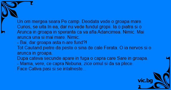 Un om mergea seara Pe camp. Deodata vede o groapa mare. Curios, se uita In ea, dar nu vede fundul gropii. Ia o piatra si o Arunca in groapa in speranta ca va afla Adancimea. Nimic. Mai arunca una si mai mare. Nimic. - Bai, dar groapa asta n-are fund?! Tot Cautand pietre da peste o sina de cale Ferata. O ia nervos si o arunca in groapa. Dupa cateva secunde apare in fuga o capra care Sare in groapa. - Mama, vere, ce capra Nebuna, zice omul si da sa plece. Face Cativa pasi si se intalneste cu un tip care-l Intreaba: - Nene, n-ai vazut capra mea? - Pai am vazut o capra care fugea ca nebuna si s-a aruncat Intr-o groapa. - Сuм a facut de-a scapat, Ca doar o legasem de ditamai sina de tren!