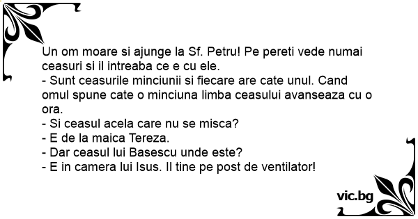 Un om moare si ajunge la Sf. Petru! Pe pereti vede numai ceasuri si il intreaba ce e cu ele.