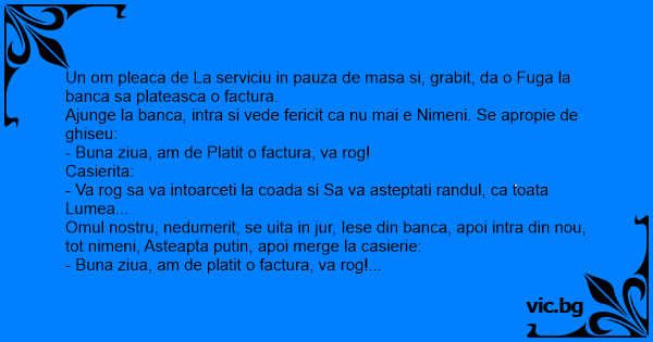 Omul nostru, nedumerit, se uita in jur, Iese din banca, apoi intra din nou, tot nimeni, Asteapta putin, apoi merge la casierie:
