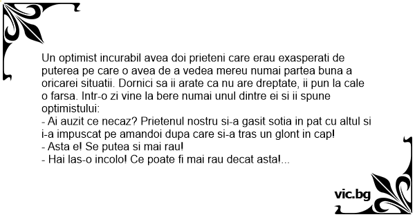 Un optimist incurabil avea doi prieteni care erau exasperati de puterea pe care o avea de a vedea mereu numai partea buna a oricarei situatii. Dornici sa ii arate ca nu are dreptate, ii pun la cale o farsa. Intr-o zi vine la bere numai unul dintre ei si ii spune optimistului: