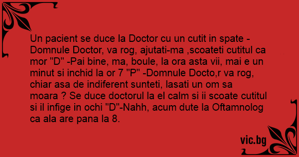 Un pacient se duce la Doctor cu un cutit in spate -Domnule Doctor, va rog, ajutati-ma ,scoateti cutitul ca mor "D" -Pai bine, ma, boule, la ora asta vii, mai e un minut si inchid la or 7 "P" -Domnule Docto,r va rog, chiar asa de indiferent sunteti, lasati un om sa moara ? Se duce doctorul la el calm si ii scoate cutitul si il infige in ochi "D"-Nahh, acum dute la Oftamnolog ca ala are pana la 8.