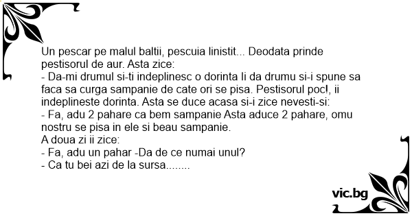 - Da-mi drumul si-ti indeplinesc o dorinta Ii da drumu si-i spune sa faca sa curga sampanie de cate ori se pisa. Pestisorul poc!, ii indeplineste dorinta. Asta se duce acasa si-i zice nevesti-si: