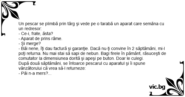 După două săptămâni, se întoarce pescarul cu aparatul şi îi spune vânzătorului că vrea să-l returneze: