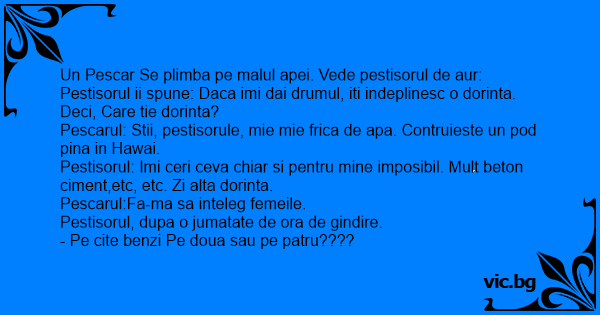 Pestisorul ii spune: Daca imi dai drumul, iti indeplinesc o dorinta. Deci, Care tie dorinta?