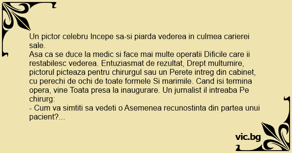 Asa ca se duce la medic si face mai multe operatii Dificile care ii restabilesc vederea. Entuziasmat de rezultat, Drept multumire, pictorul picteaza pentru chirurgul sau un Perete intreg din cabinet, cu perechi de ochi de toate formele Si marimile. Cand isi termina opera, vine Toata presa la inaugurare. Un jurnalist il intreaba Pe chirurg: