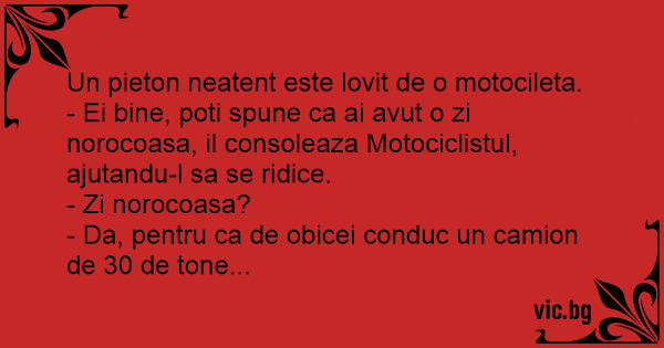 - Ei bine, poti spune ca ai avut o zi norocoasa, il consoleaza Motociclistul, ajutandu-l sa se ridice.