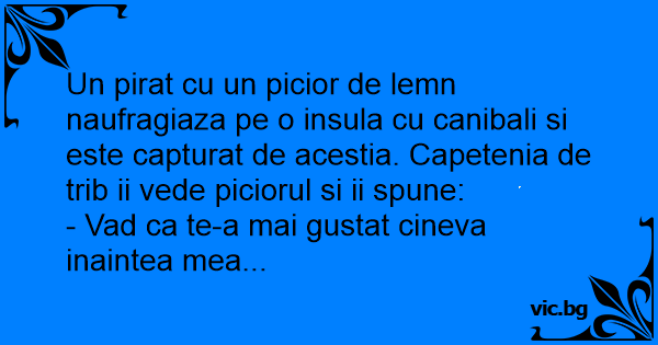 Un pirat cu un picior de lemn naufragiaza pe o insula cu canibali si este capturat de acestia. Capetenia de trib ii vede piciorul si ii spune:
