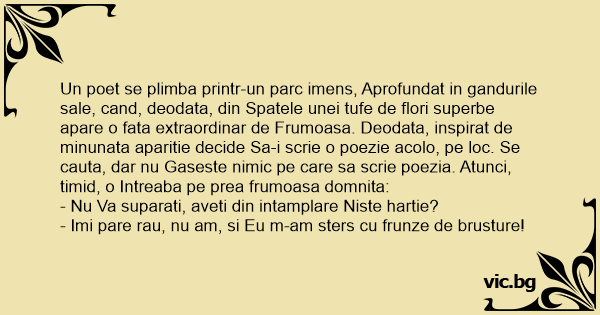 Un poet se plimba printr-un parc imens, Aprofundat in gandurile sale, cand, deodata, din Spatele unei tufe de flori superbe apare o fata extraordinar de Frumoasa. Deodata, inspirat de minunata aparitie decide Sa-i scrie o poezie acolo, pe loc. Se cauta, dar nu Gaseste nimic pe care sa scrie poezia. Atunci, timid, o Intreaba pe prea frumoasa domnita: