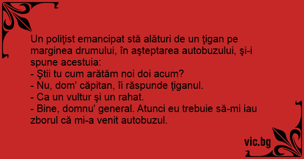 Un poliţist emancipat stă alături de un ţigan pe marginea drumului, în aşteptarea autobuzului, şi-i spune acestuia: