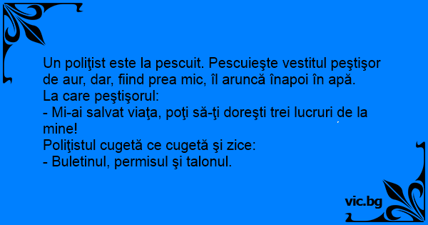 Un poliţist este la pescuit. Pescuieşte vestitul peştişor de aur, dar, fiind prea mic, îl aruncă înapoi în apă.