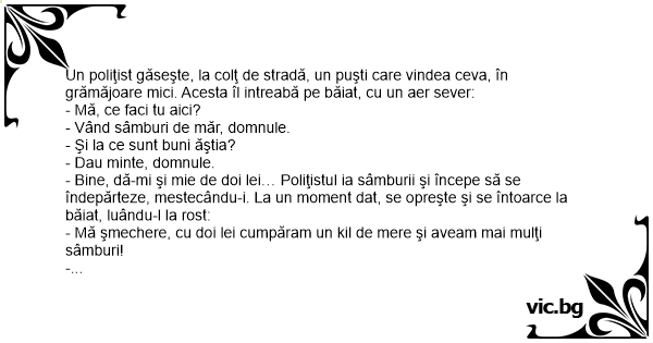 - Bine, dă-mi şi mie de doi lei… Poliţistul ia sâmburii şi începe să se îndepărteze, mestecându-i. La un moment dat, se opreşte şi se întoarce la băiat, luându-l la rost: