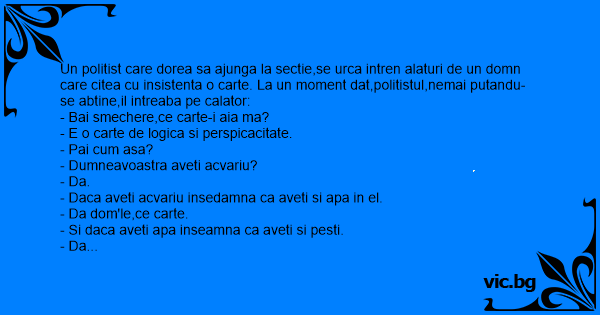 Jde mladý policajt po chodbě a potká starého s knížkou po boku. Mladý se ho ptá: „Co je to za knížku?” „To je logika.” „Aha, a na co to je?” „No, vysvětlím ti to na příkladě: Máš doma akvárium?”...
