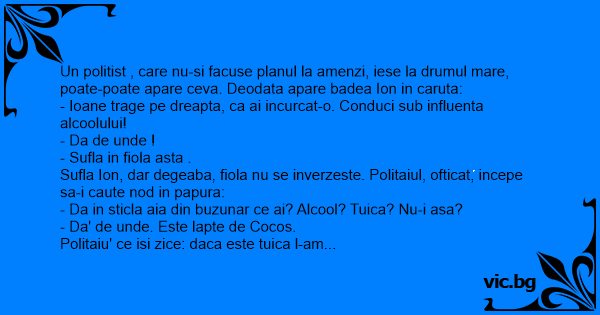 - Ioane trage pe dreapta, ca ai incurcat-o. Conduci sub influenta alcoolului!