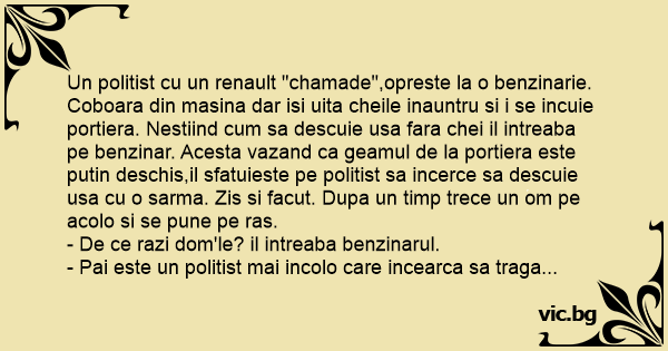 Coboara din masina dar isi uita cheile inauntru si i se incuie portiera. Nestiind сuм sa descuie usa fara chei il intreaba pe benzinar. Acesta vazand ca geamul de la portiera este putin deschis,il sfatuieste pe politist sa incerce sa descuie usa cu o sarma. Zis si facut. Dupa un timp trece un om pe acolo si se pune pe ras.