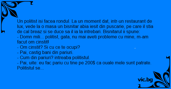 Un politist isi facea rondul. La un moment dat, intr-un restaurant de lux, vede la o masa un bisnitar abia iesit din puscarie, pe care il stia de cal breaz si se duce sa il ia la intrebari. Bisnitarul ii spune: