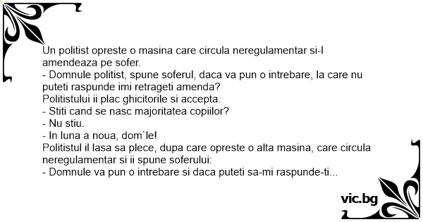 - Domnule politist, spune soferul, daca va pun o intrebare, la care nu puteti raspunde imi retrageti amenda?
