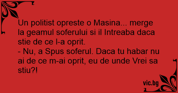 Un politist opreste o Masina... merge la geamul soferului si il Intreaba daca stie de ce l-a oprit.