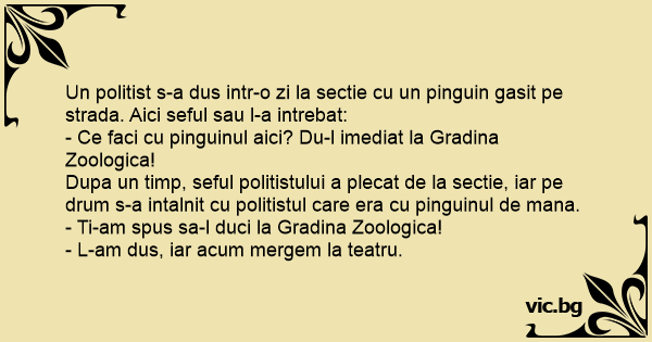 Un politist s-a dus intr-o zi la sectie cu un pinguin gasit pe strada. Aici seful sau l-a intrebat: