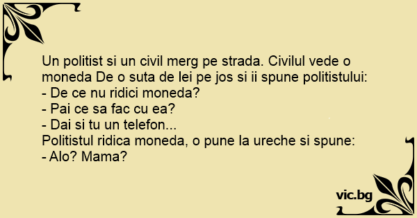 Politistul ridica moneda, o pune la ureche si spune: