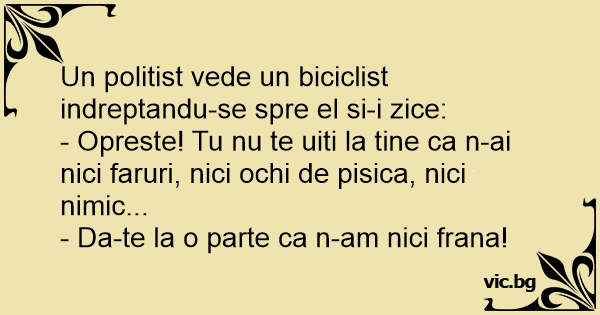 Un politist vede un biciclist indreptandu-se spre el si-i zice: - Opreste! Tu nu te uiti la tine ca n-ai nici faruri, nici ochi de pisica, nici nimic... - Da-te la o parte ca n-am nici frana!