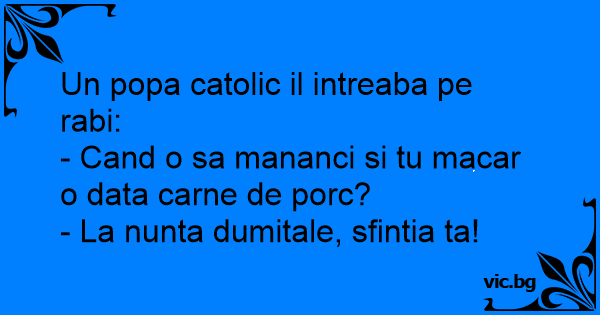 Beszélget a katolikus pap a rabbival: - Mondd, mikor térsz el attól a hülyeségtől hogy nem eszel disznóhúst? Mire a rabbi: - Az esküvődön.