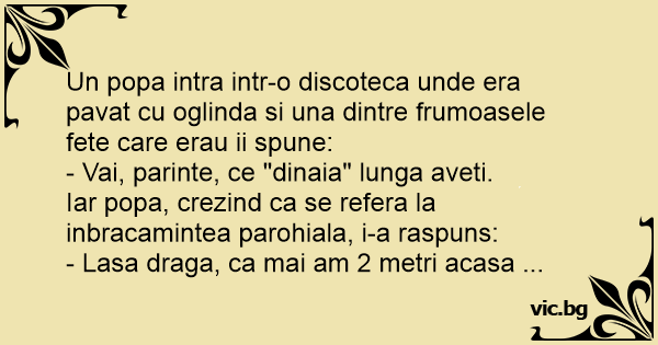 Un popa intra intr-o discoteca unde era pavat cu oglinda si una dintre frumoasele fete care erau ii spune: