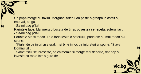Un popa merge cu taxiul. Mergand soferul da peste o groapa in asfalt si, enervat, striga: