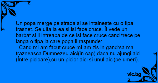 Un popa merge pe strada si se intalneste cu o tipa trasnet. Se uita la ea si isi face cruce. Îl vede un barbat si il intreaba de ce isi face cruce cand trece pe langa o tipa,la care popa ii raspunde: