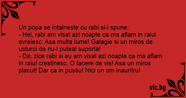 - Hei, rabi am visat azi noapte ca ma aflam in raiul evreiesc: Asa multa lume! Galagie si un miros de usturoi de nu-l puteai suporta!